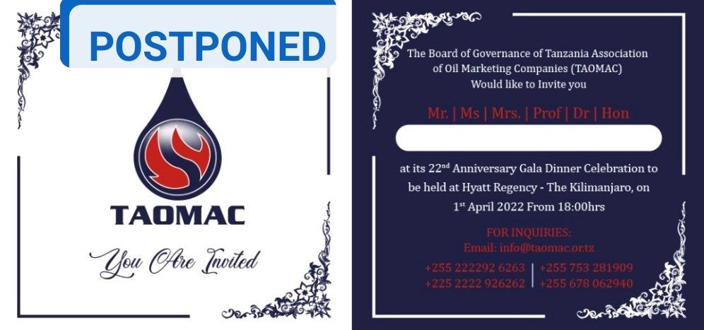 On behalf of the TAOMAC Board of Governance, We wish to inform our Members and Stakeholders that, due to circumstances beyond our control the Gala Dinner which was scheduled on 1st April 2022 has been postponed until further notice.